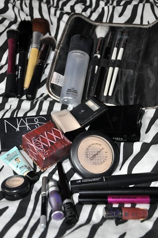 Porefessional, Skinbase, Concealer, MSF, Powder Foundation, Bronzer, Blush, Highlight, Fix+, Eye Primer, Liquid Liner, Pencil Liner, Mascara, 2 Lipsticks, 1 Lipgloss, Naked Palette and Brushes. I also threw in a pair of eyelashes in case we go for a meal and I want to dress up a little.